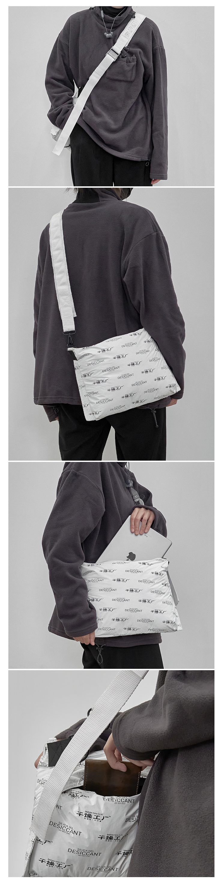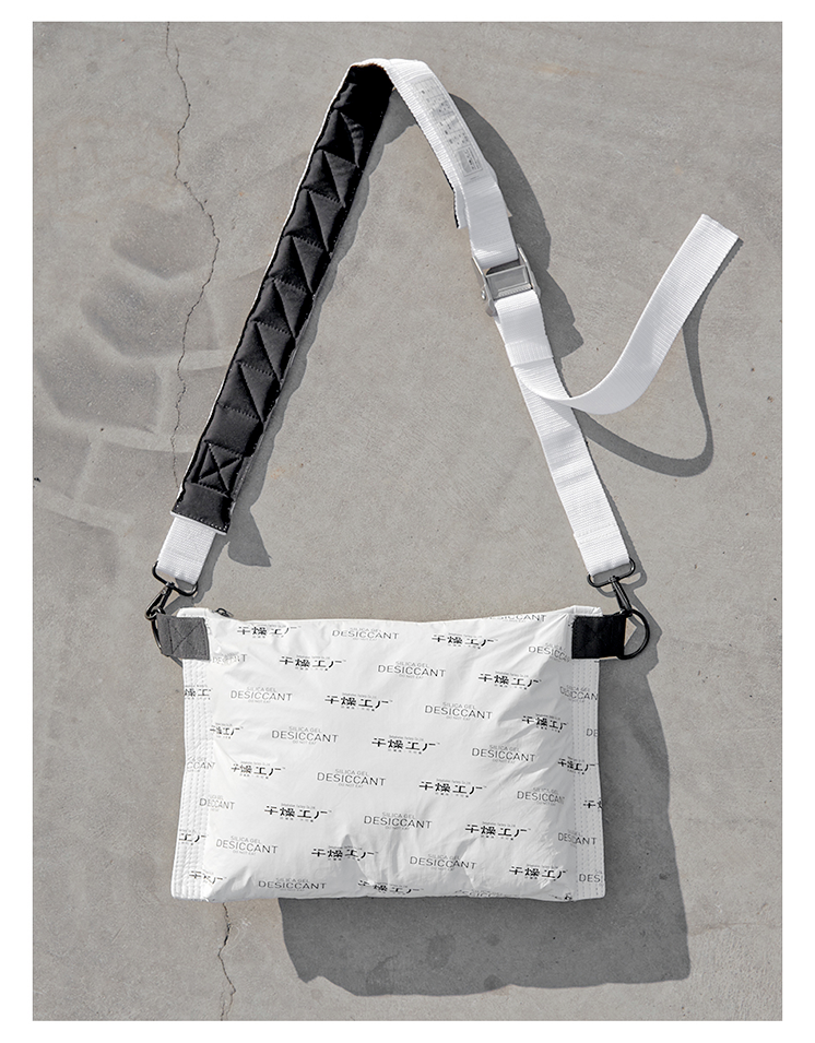 恰如其名,非常干燥。整个包身设计模拟干燥剂,由软型杜邦纸制成,背带和搭扣的设计借鉴了重工业最常见的高空作业安全带。
