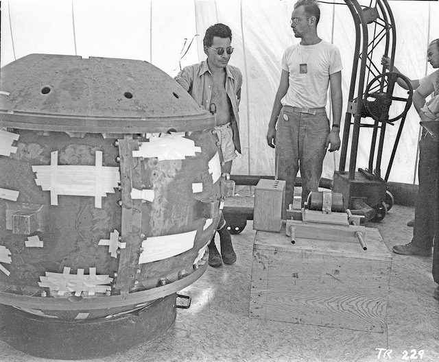 比如内爆型原子弹「小玩意儿」,通体银灰,外层不规则的白色部分实际上是一层层胶带,为了密封,防止沙尘进入内部。
