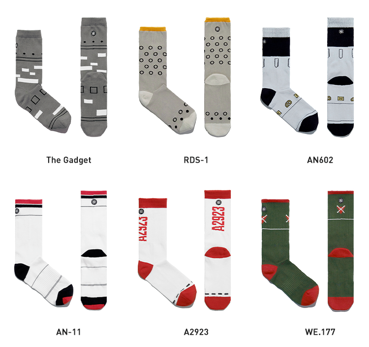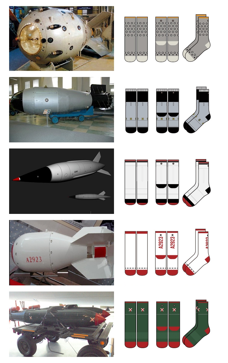 灵感来源于第 57 期回形针正片《原子弹制造指南》,这次我们集结了 6 颗世界历史上出现过的代表性核弹,设计出 6 款独家袜子。