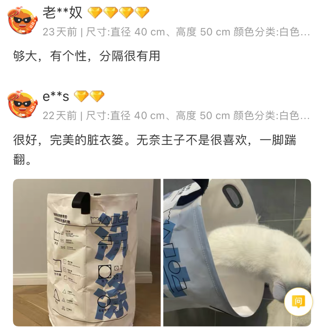 水洗标脏衣桶是三款产品中我们认为最有特色的一个。买家对它的评价和我们自己的感受一样,主要集中在「设计酷」、「容量大」、「水洗标信息和分隔袋设计很实用」这三点。