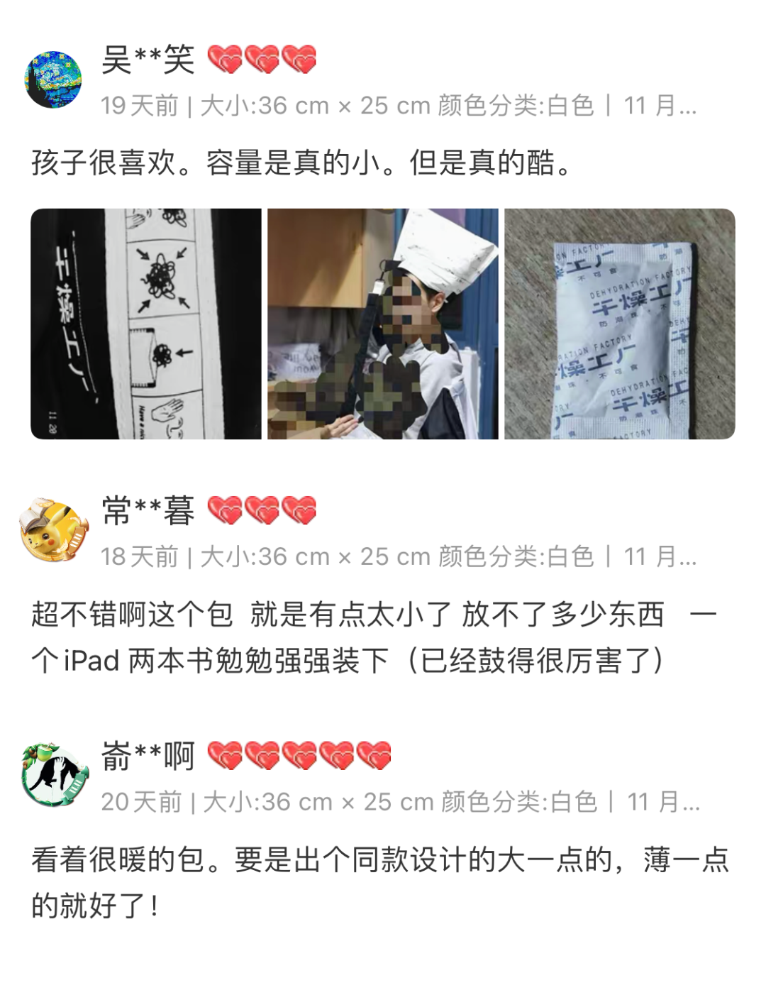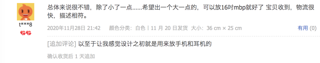 但这么多针对尺寸的反馈,也让我们意识到,在设计产品时没有照顾到大家最迫切的需求。所以,实用、能装电脑、还好看的包会有的,敬请期待!