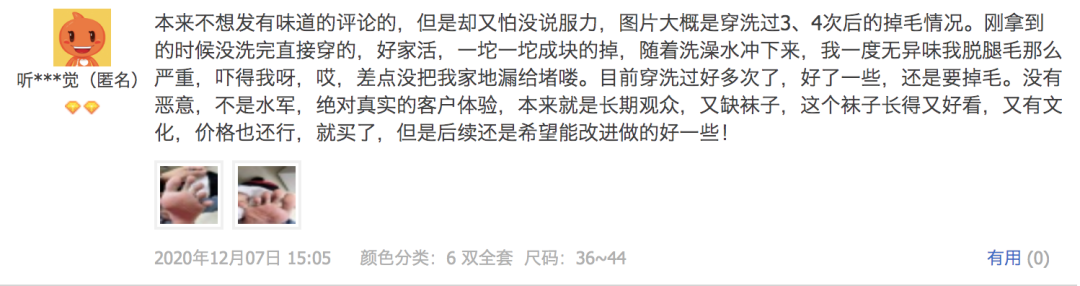 当然也有负面的评价,主要是 3~4 个关于袜子掉毛的反馈。很抱歉给你们带来不算美好的使用体验。
