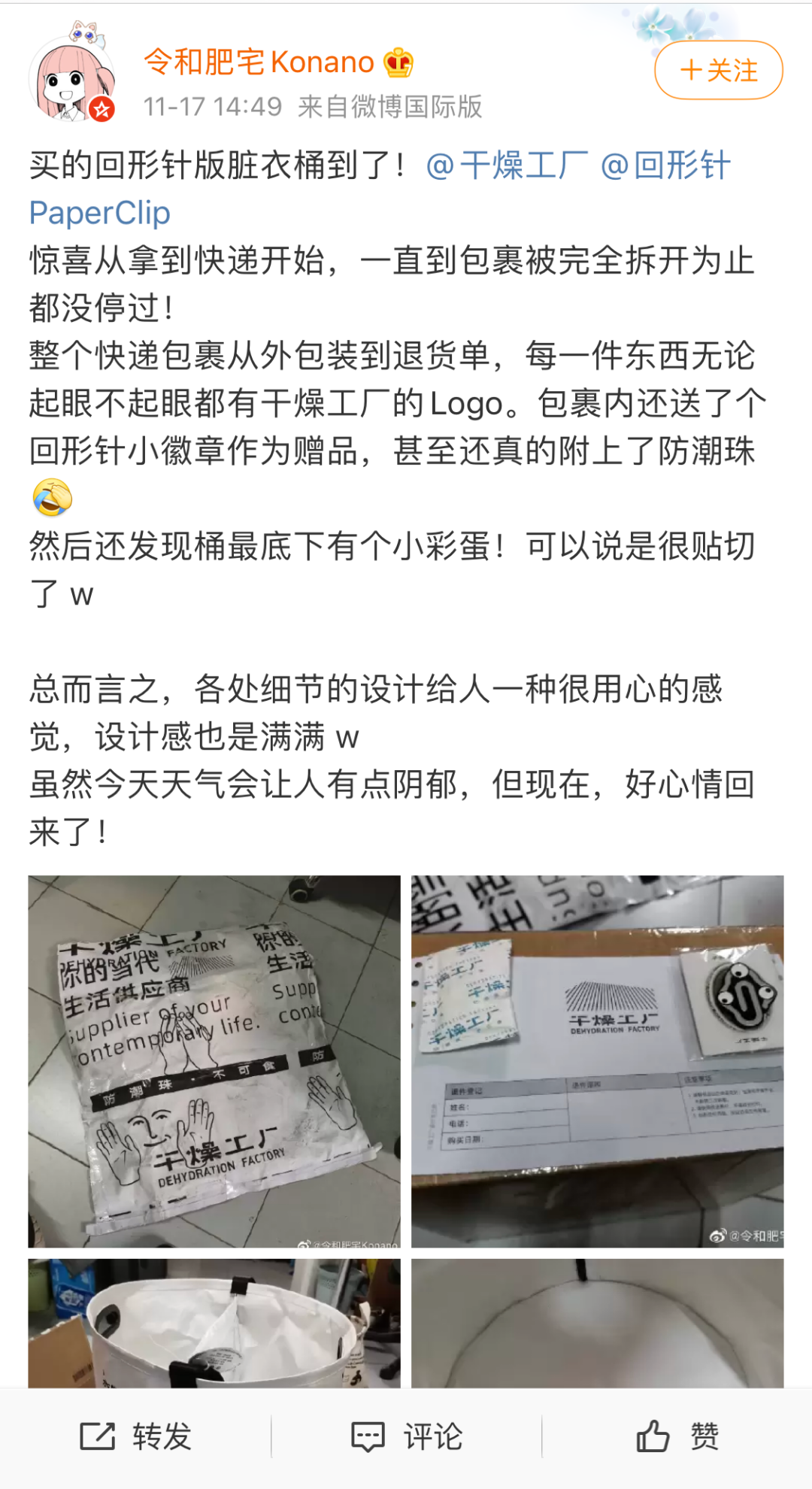 我们在 11 月 16 日收到第一例关于把手脱落的反馈, 17 日改进了包装方案。那两天接连有不少买家反映了相同问题,我们十分担心脏衣桶的运损率过高,于是在 18 日主动下架了脏衣桶。