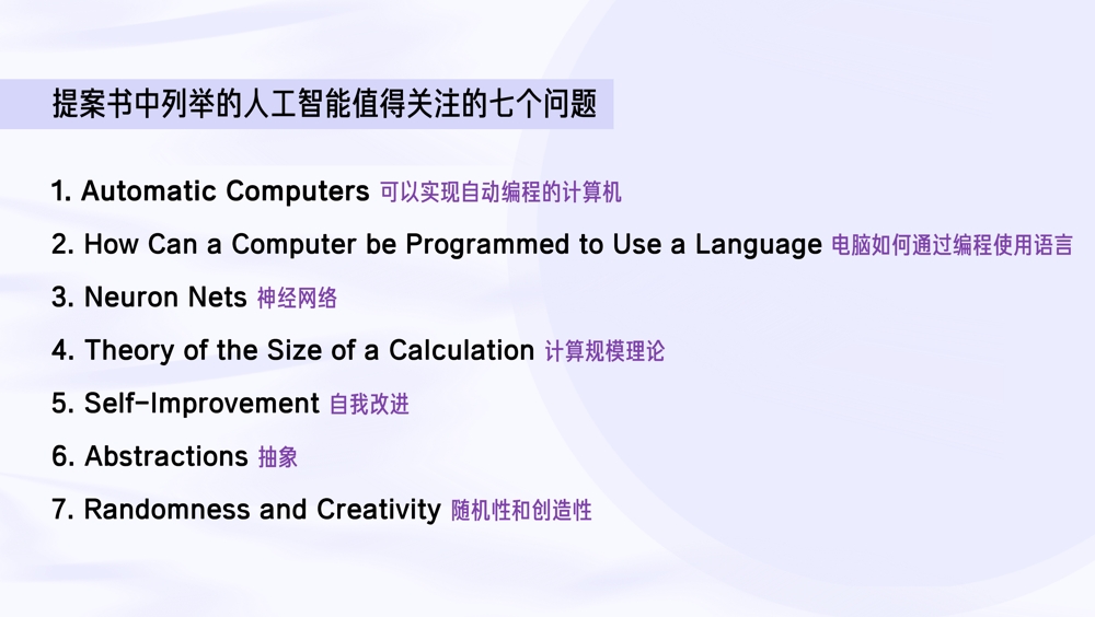 和他一起发起倡议的是来自贝尔实验室的克劳德·香农,来自 IBM 的尼尔·罗切斯特,和时任哈佛大学数学系和神经学系初级研究员的马文·明斯基。