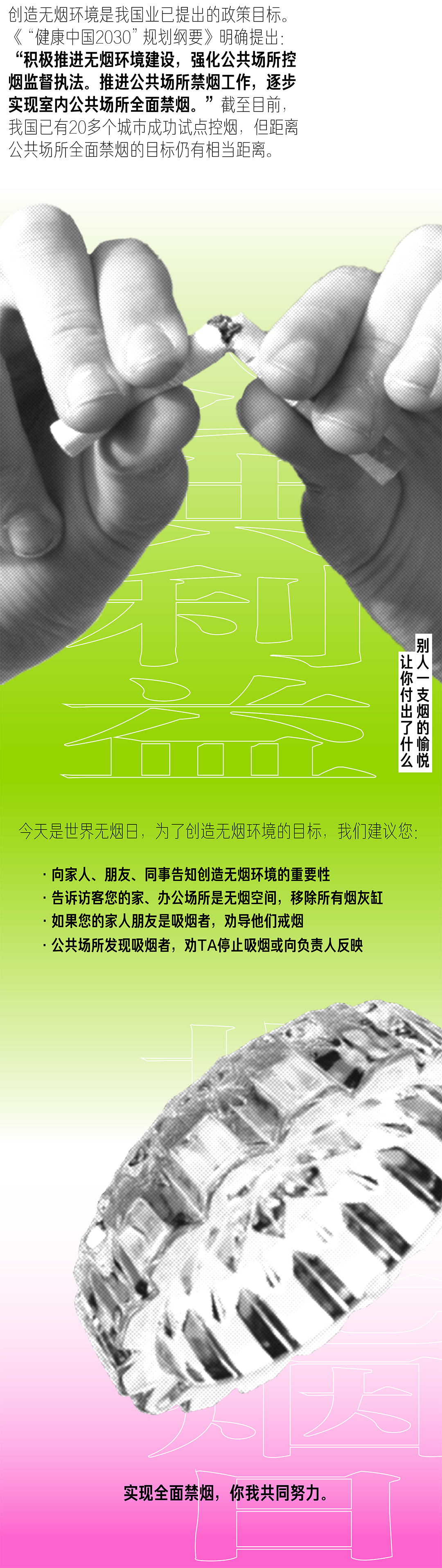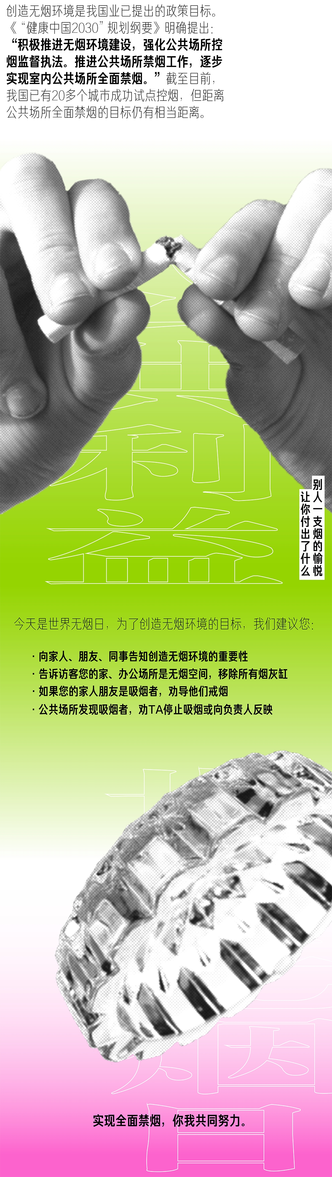 *#无烟不只今天#是由中国健康教育中心主办,北京市控制吸烟协会、上海市控制吸烟协会、广东省控制吸烟协会、深圳市控制吸烟协会协办,新榜作为独家新媒体传播平台合作的“531世界无烟日”线上传播行动。*此次,回形针作为新媒体内容共创参与机构之一,希望以内容传播呼吁大家关注控烟,支持室内公共场所、工作场所和公共交通工具全面禁烟。