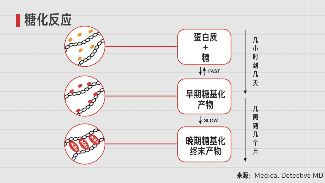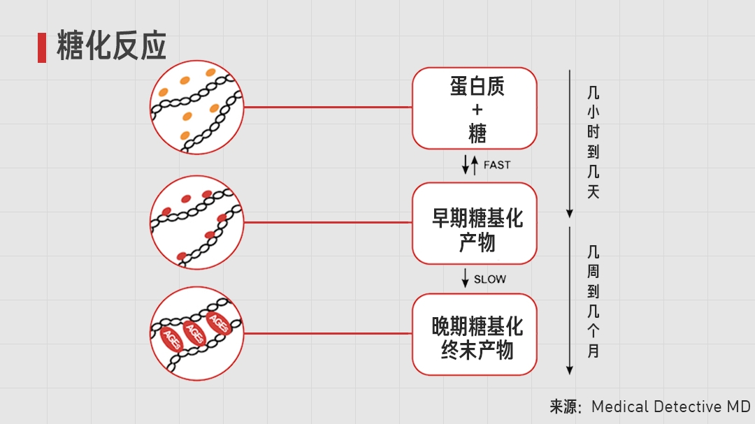 但如果没有,接着他们会形成晚期糖基化终末产物(AGEs),且不可逆,这一过程就是我们常说的糖化反应。