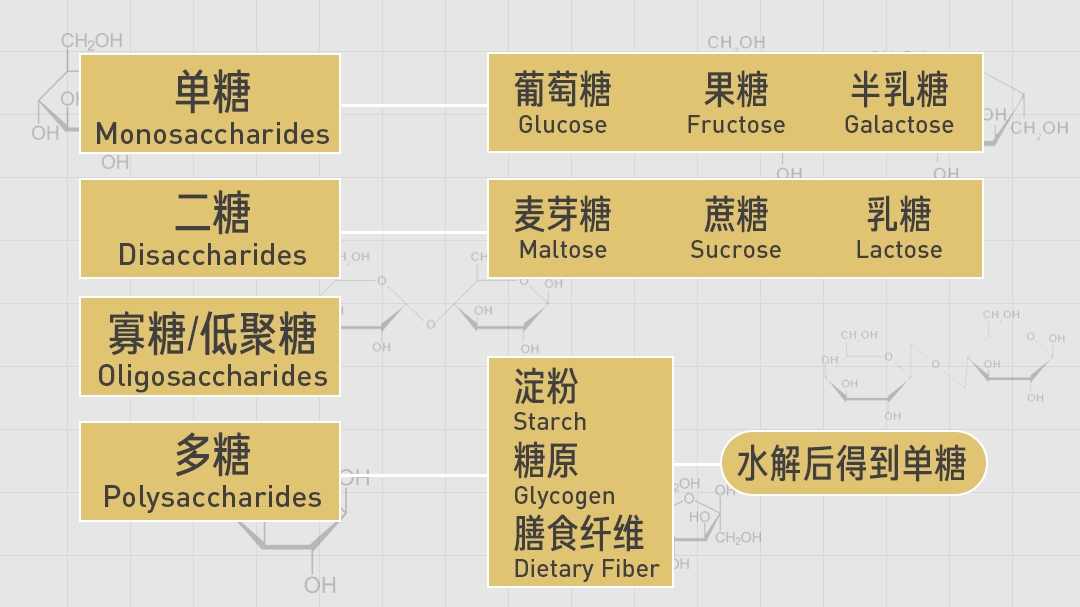 从狭义上讲,糖类也被称为碳水化合物,依照单糖单元的数量可分为单糖、二糖、寡糖和多糖。其中多糖就包括淀粉、糖原和膳食纤维。