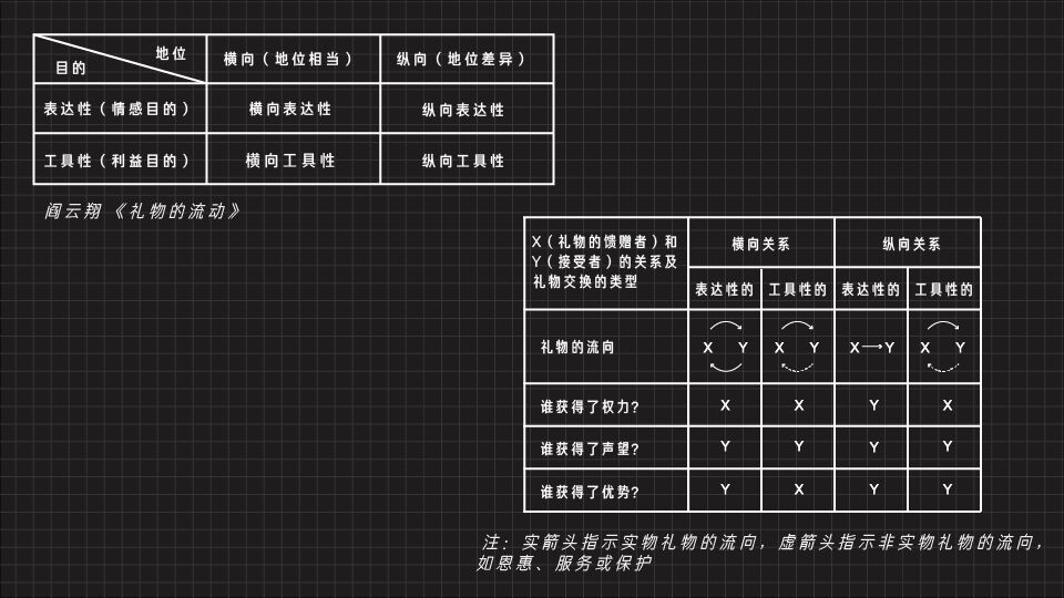 而在中国,礼物之灵就是人情,中国人类学家阎云翔将送礼的目的分为表达性和工具性,把收礼者分为地位相当的横向,和有地位差异的纵向两种。