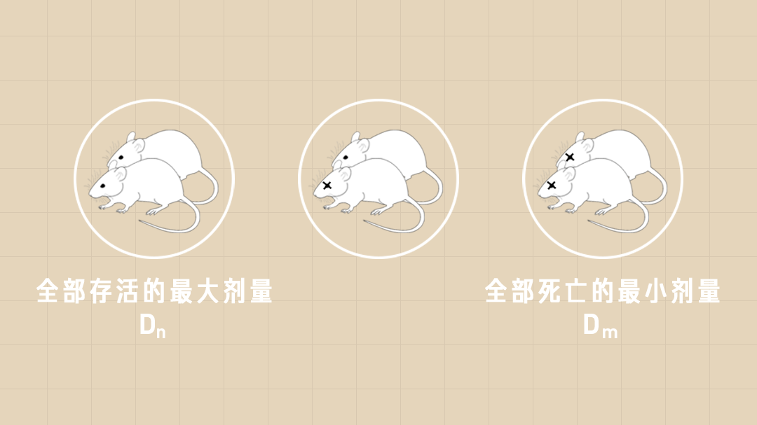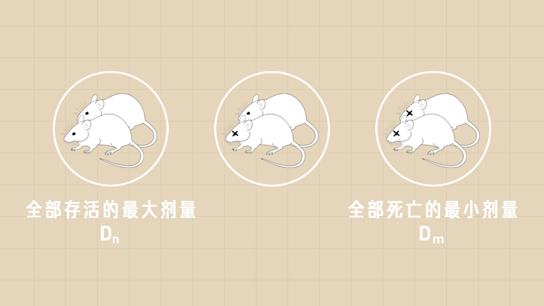 首先,找到一群身体状态相同的健康小白鼠,以 2~3 只为一组,通过摸索得出使小白鼠全部死亡时的最小剂量 Dm,和小白鼠全部存活时的最大剂量 Dn。