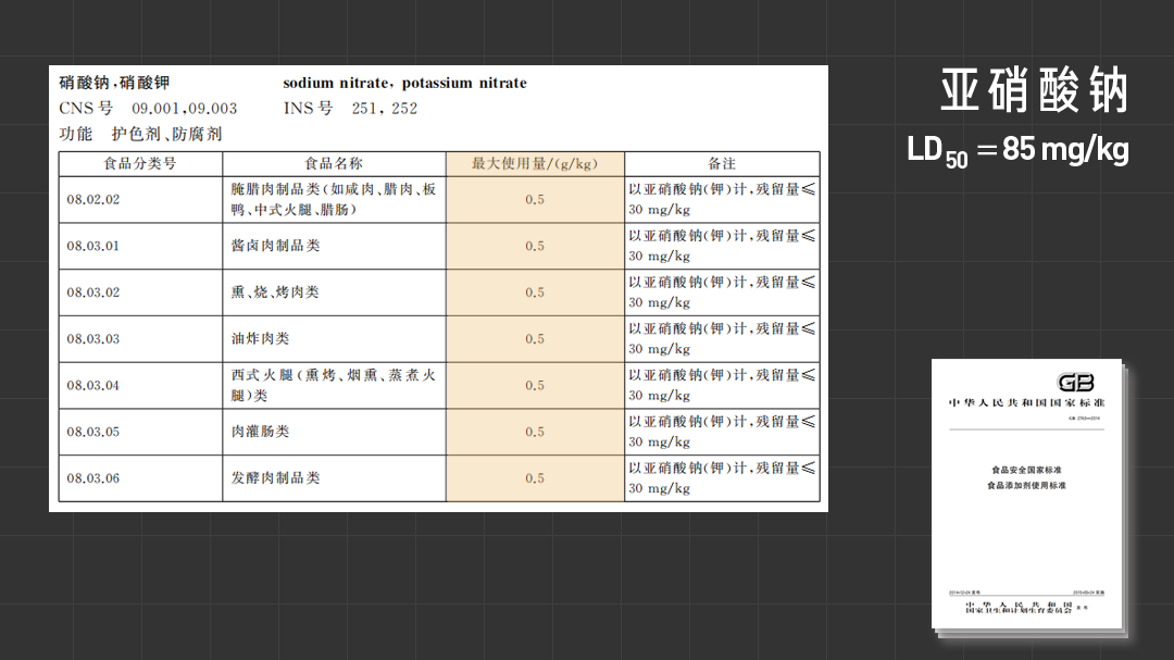 但也有例外。比如《标准》中允许在肉类中使用的亚硝酸钠,其半数致死量仅为 85 mg/kg,而且在体内容易代谢成亚硝胺,诱发癌症。