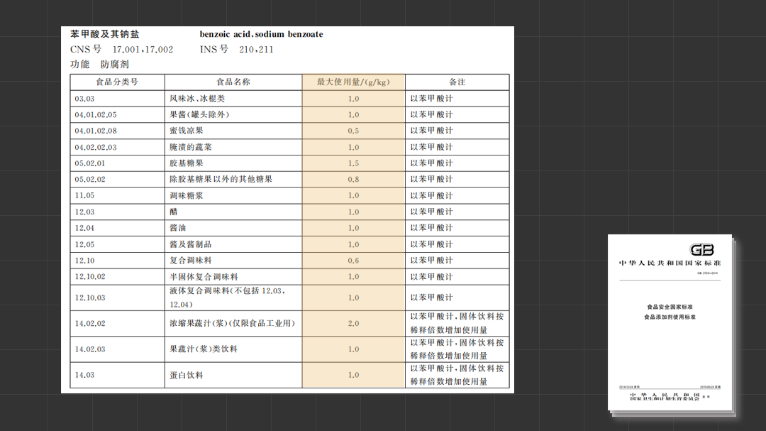 国家卫生计生委发布的《食品添加剂使用标准》中,允许了类似的 26 个类型,共 32 种防腐剂的使用,它们能被添加在各种类型的食品中。