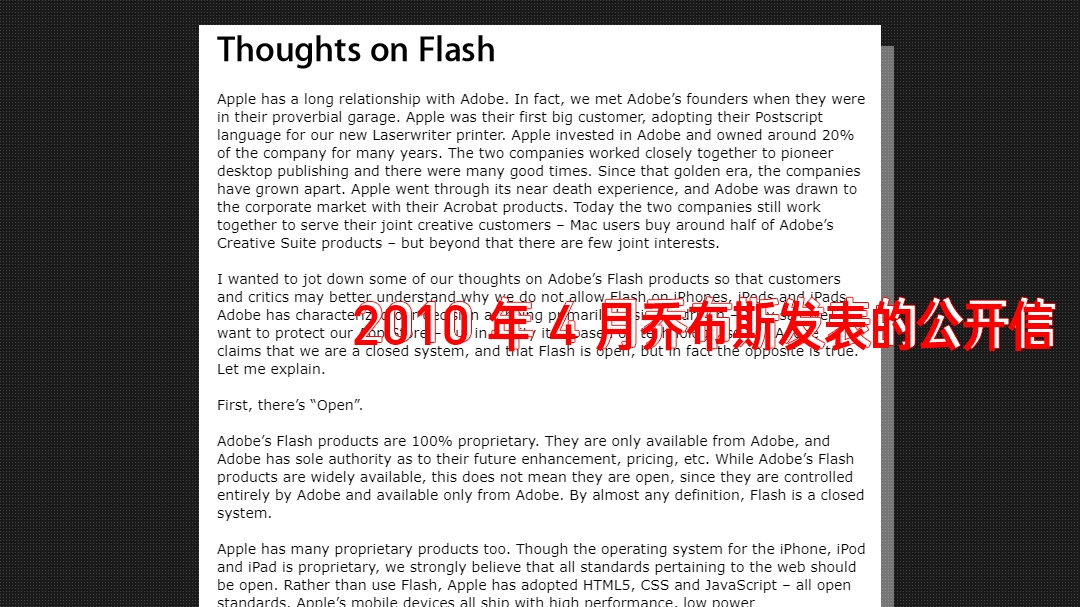 2010 年,苹果 CEO 乔布斯公开表示,拒绝 Flash 在 iPhone 上运行。乔布斯指责 Flash 封闭且专有,具有严重的技术缺陷,不支持基于多点触控设备。