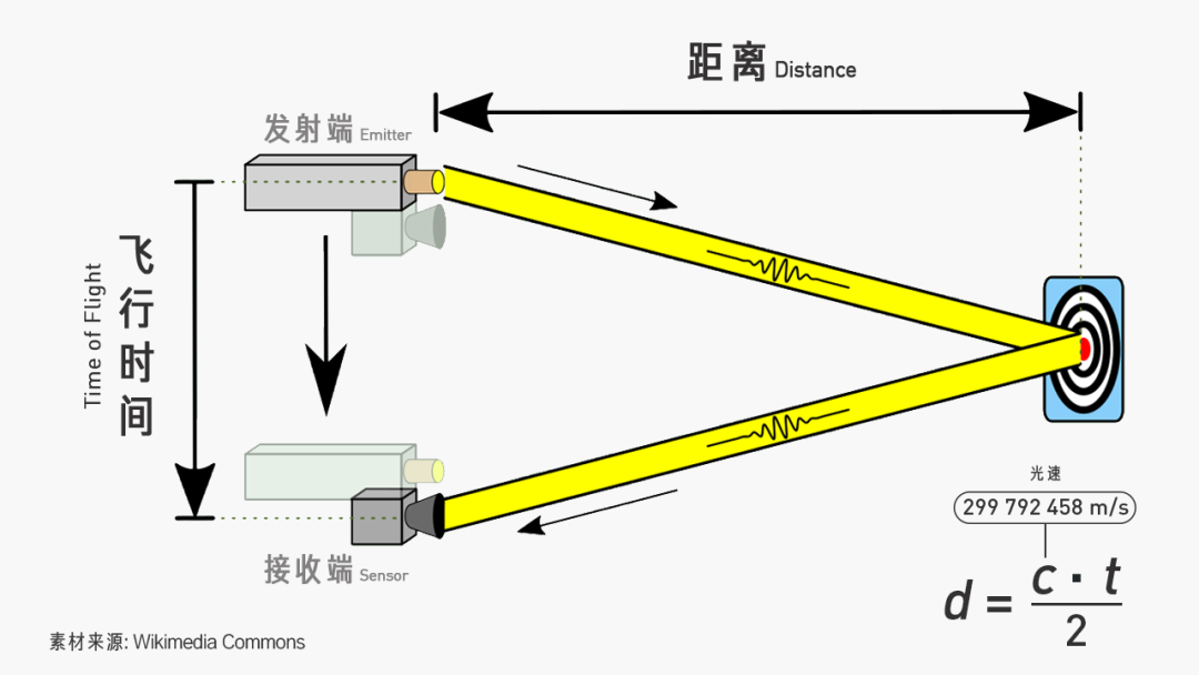 在这块圆形黑色区域之下,LiDAR 主要由两部分组成:发射端和接收端。垂直腔面发射激光器(VCSEL)作为发射端,向物体发射一束红外光,经反射被 CMOS 图像传感器接收,光束经历的这一段时间被称为飞行时间(ToF)。