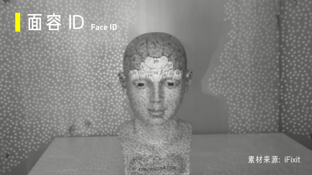 从红外摄像机拍摄到的光斑可以看出,Face ID 的结构光传感器通过点阵投影发射出超过 3 万个不可见的光斑,利用扭曲建模,制作出一张准确的面部深度图,从而将 2D 的图像转换为带有深度信息的 3D 图像。受距离所限,只能进行小范围的 3D 绘制,用于人脸识别。