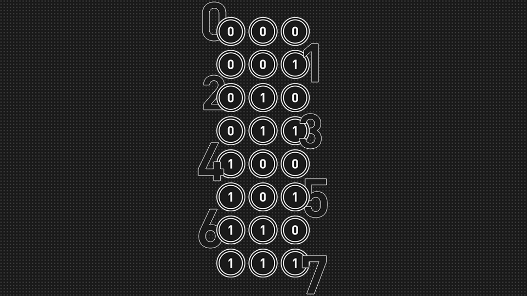 这样,仅用三枚硬币,就能同时携带 0~7 这 8 个数字的信息。
