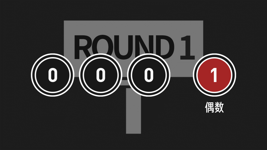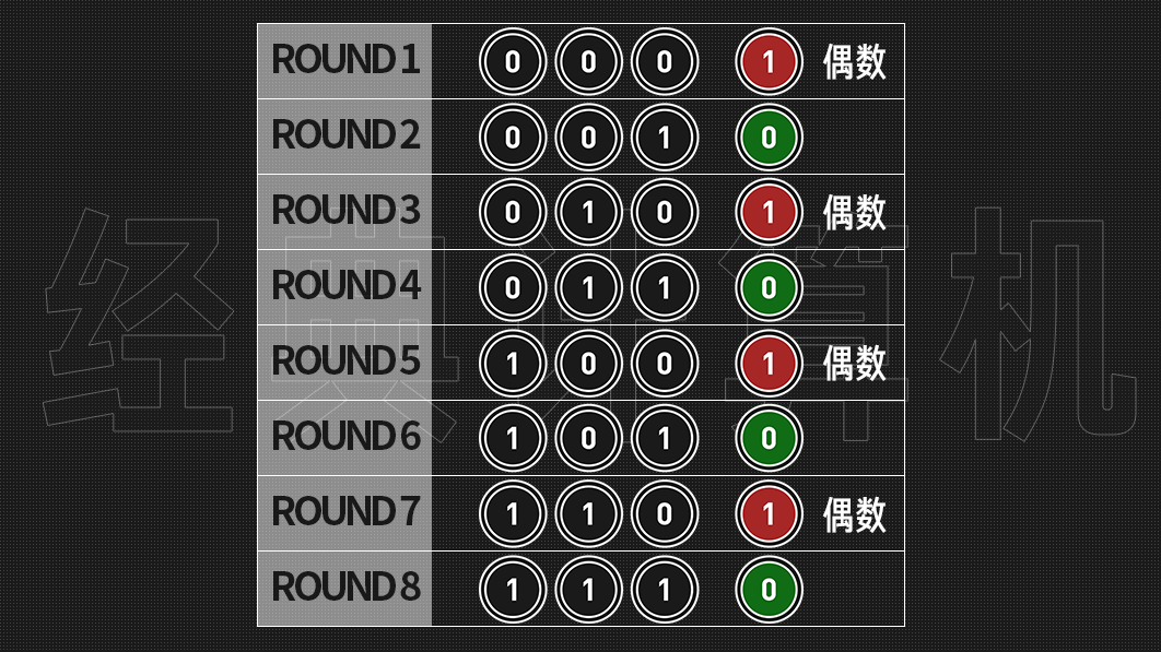 先把硬币按 000 放好,判断第三枚硬币。是 0,就让第四枚硬币显示 1,表示这个数是偶数;反之则让第四枚硬币显示 0,表示奇数。