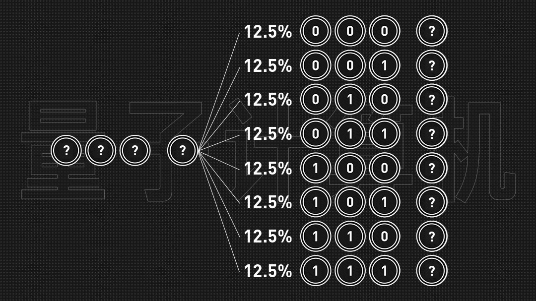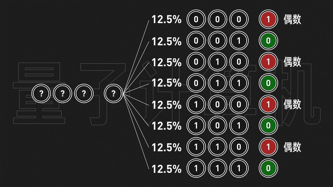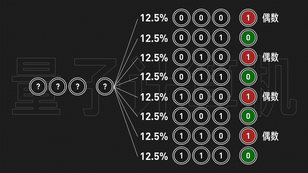 经过以上操作,量子计算机的四枚硬币得到了一个叠加态:12.5% 的(000 1+001 0+010 1+011 0+100 1+101 0+110 1+111 0)。