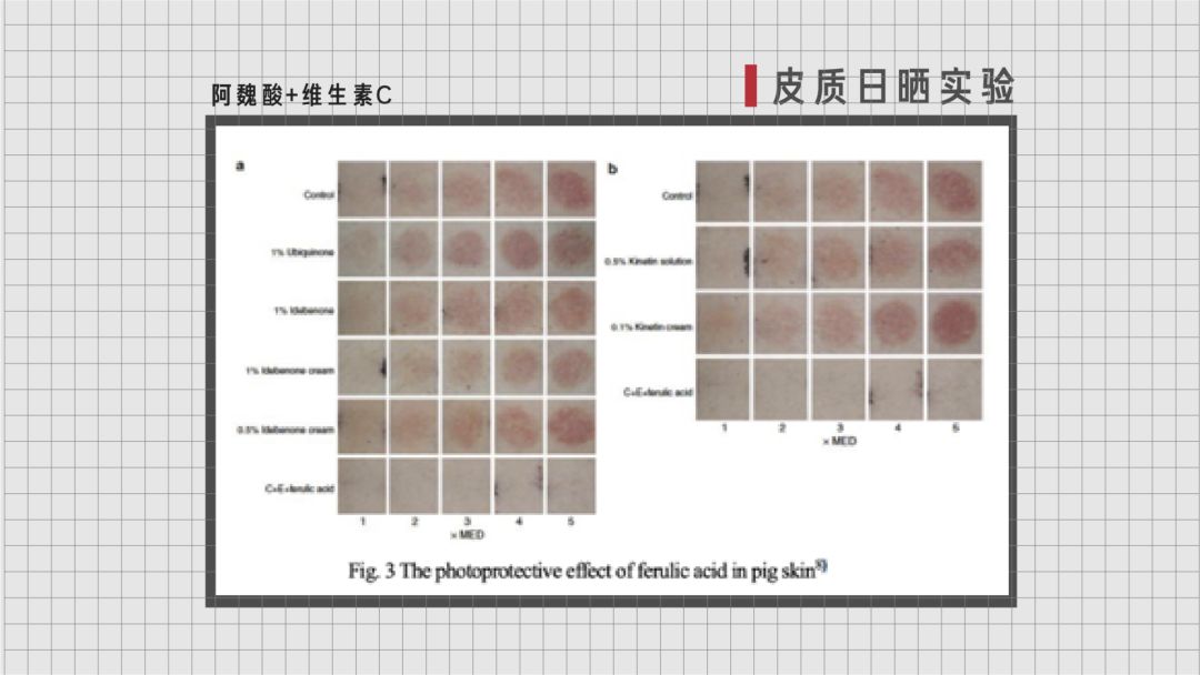 阿魏酸的抗氧化能力已足够强大,当阿魏酸和抗氧化的尖兵——维生素 C 同时使用时,除了能发挥出自己的功效,还能将维生素C对抗日晒的能力从 4 倍提高到 8 倍。这是阿魏酸与维生素 C结合后对猪皮进行的日晒实验结果。