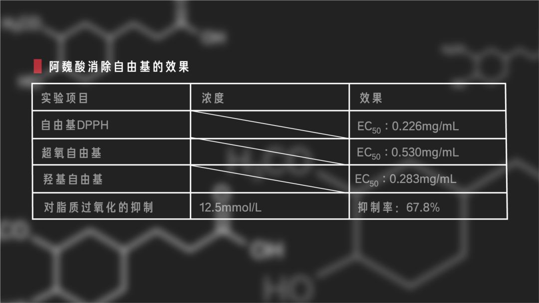 可以看出,“阿魏酸+维生素C”组合可以有效改善皮肤受到的紫外线伤害,减少色素过度沉着的产生,加强抗氧化的效果。