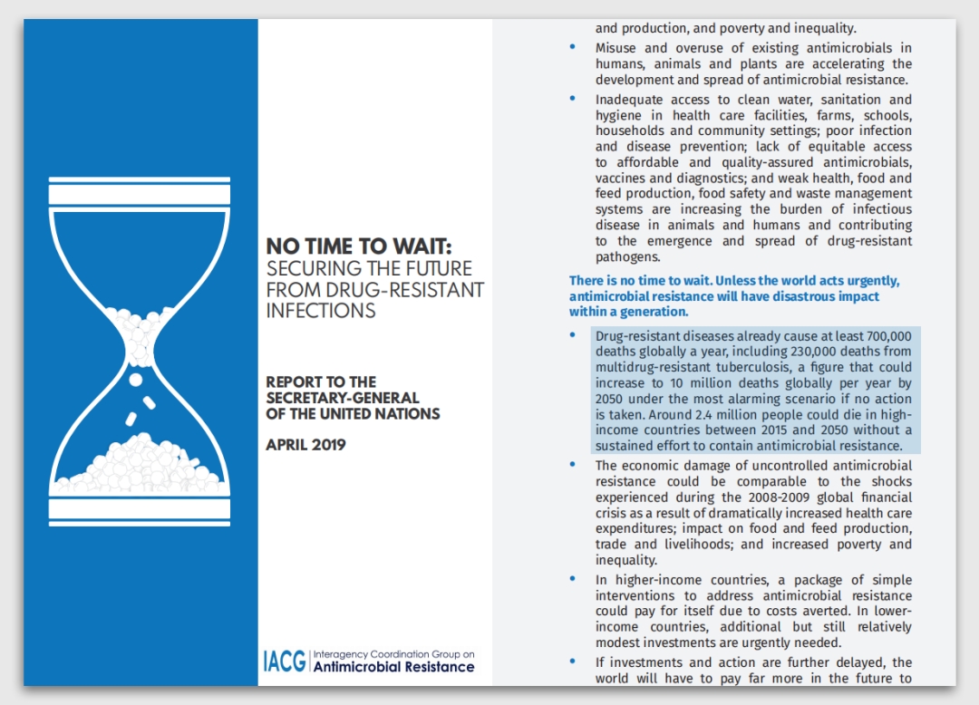 2019 年 4 月,联合国的一份报告表明,全球每年至少有 70 万人死于抗药性疾病,其中 23 万人死于抗多药结核病。如果不采取行动,到 2050 年,最糟糕的结果是,全球每年可能会有 1000 万人死于抗药性疾病。