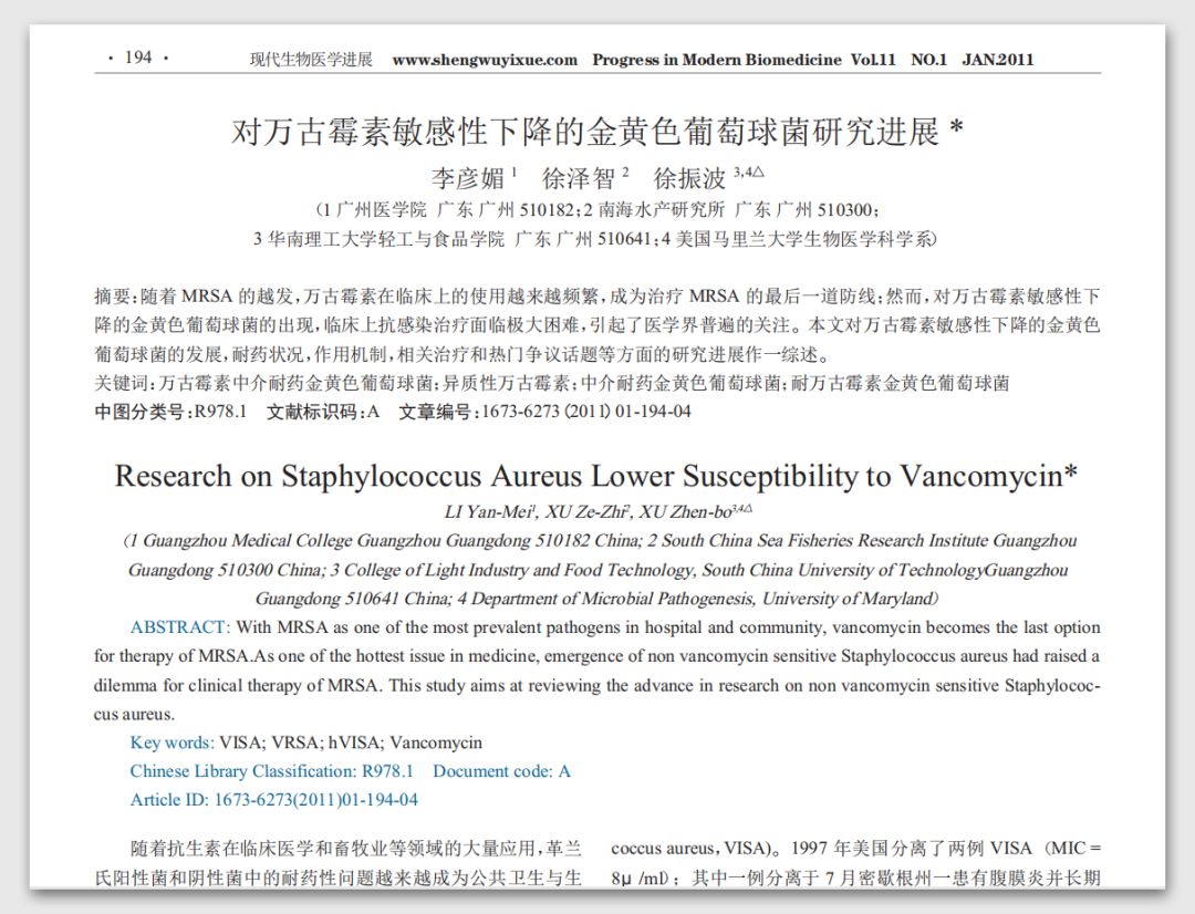 [7] 李彦媚, 徐泽智,& 徐振波. (2011). 对万古霉素敏感性下降的金黄色葡萄球菌研究进展.