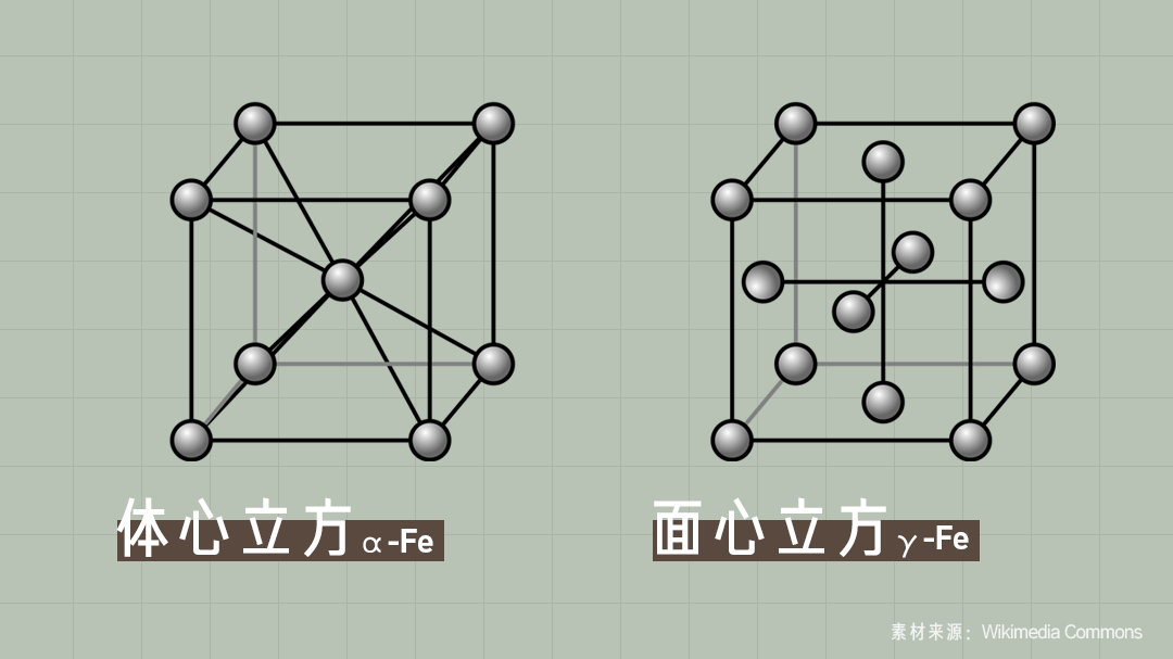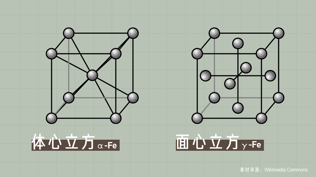 微观世界里,钢铁中铁原子的排列随温度变化而改变。低于 912 ℃ 时,铁原子会排列成体心立方,称为 α-Fe;而在 912~1394 ℃ 时,铁原子排列成面心立方,称为 γ-Fe。