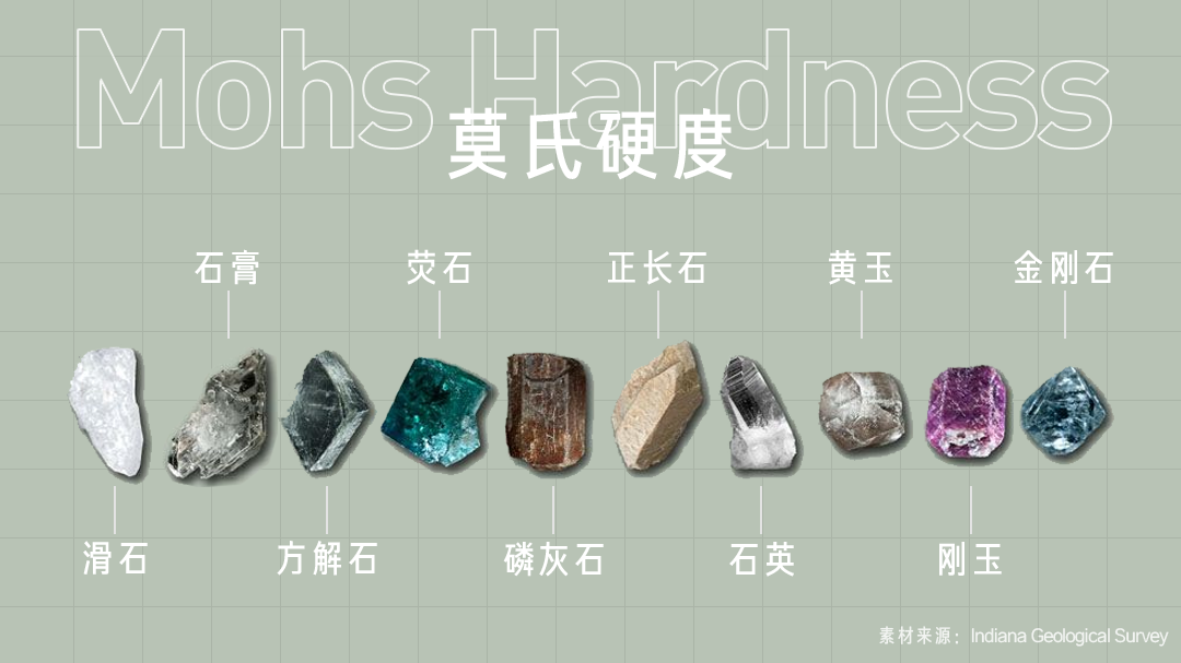 硬的东西能在软的东西上留下划痕,用这种最朴素的对比我们得到了「莫氏硬度」,钢铁的硬度大概在 5 级磷灰石和 6 级正长石之间。