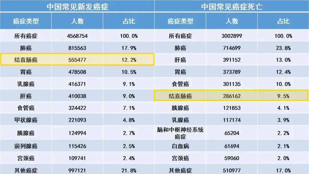 2020 年,我国有 55.5 万人新患肠癌,28.6 万人因肠癌去世,平均每 1 分钟有 1 人被诊断为肠癌,每 2 分钟便有 1 人因肠癌去世,肠癌是中国第二高发癌症,也是过去 6 年新发病例增速最快的癌症。