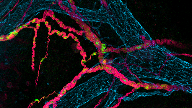 小鼠的肠神经系统(粉色为神经元)| 来源:Uesaka, et al. The Journal of Neuroscience, 2015.
