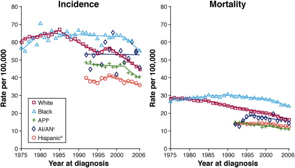 美国历年大肠癌发病率及死亡率 | 来源:https://doi.org/10.1053/j.gastro.2010.01.056