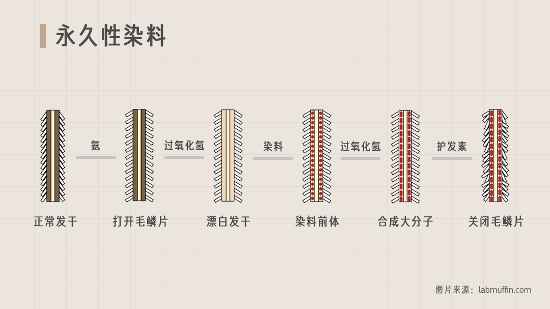 永久性染发剂并不直接敷染料,而是把合成染料的小分子的中间体、偶联剂、氧化剂渗入毛鳞片,让它们在毛皮质内发生反应,在内部合成染料大分子。