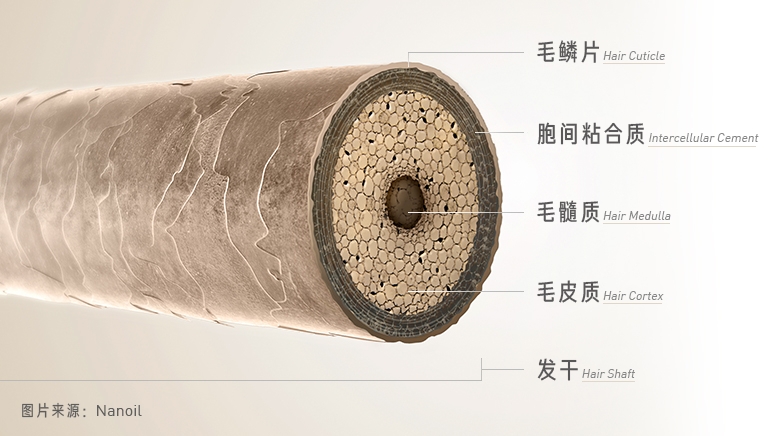 毛鳞片温顺地包裹着发芯,毛皮质集中着水分、蛋白质和黑色素,毛髓质从根部吸收营养。10 万根像这样的健康发丝生机勃勃地长在你的头皮上。