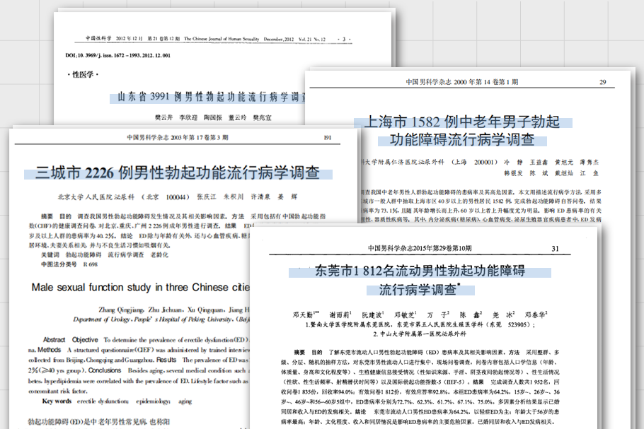 近十年来在北京、上海、重庆、广州等地针对上万例男性的调研表明,中国勃起功能障碍(ED)的患病率在调研群体中占据 25% 以上,且年龄越大,患病率越高。