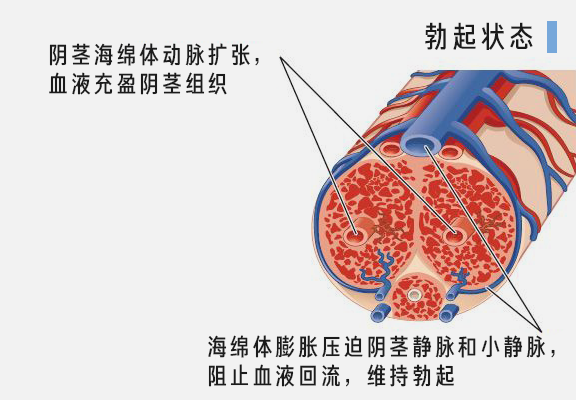 当接收到外界的性刺激时,丁丁中会产生一种叫「cGMP」的物质,它能使海绵体平滑肌松弛,让动脉血快速充满海绵体的腔隙,并暂时封闭静脉来阻止回流,将血液暂时封闭在海绵体内。