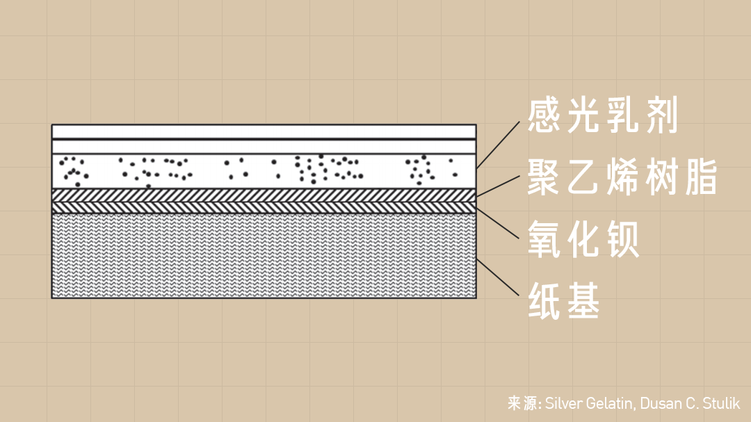 相纸的纸基与感光乳剂之间,有两层额外的保护,一层是氧化钡,增加反射率,令相纸显得更洁白光滑;另一层是聚乙烯树脂,防止冲洗时药水渗进纸基。