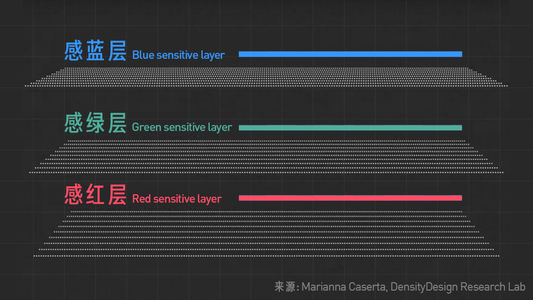 主要靠这三种感光乳剂涂层:感红层、感绿层和感蓝层,每层都含有卤化银晶体,同时其中均匀分布着成色剂。