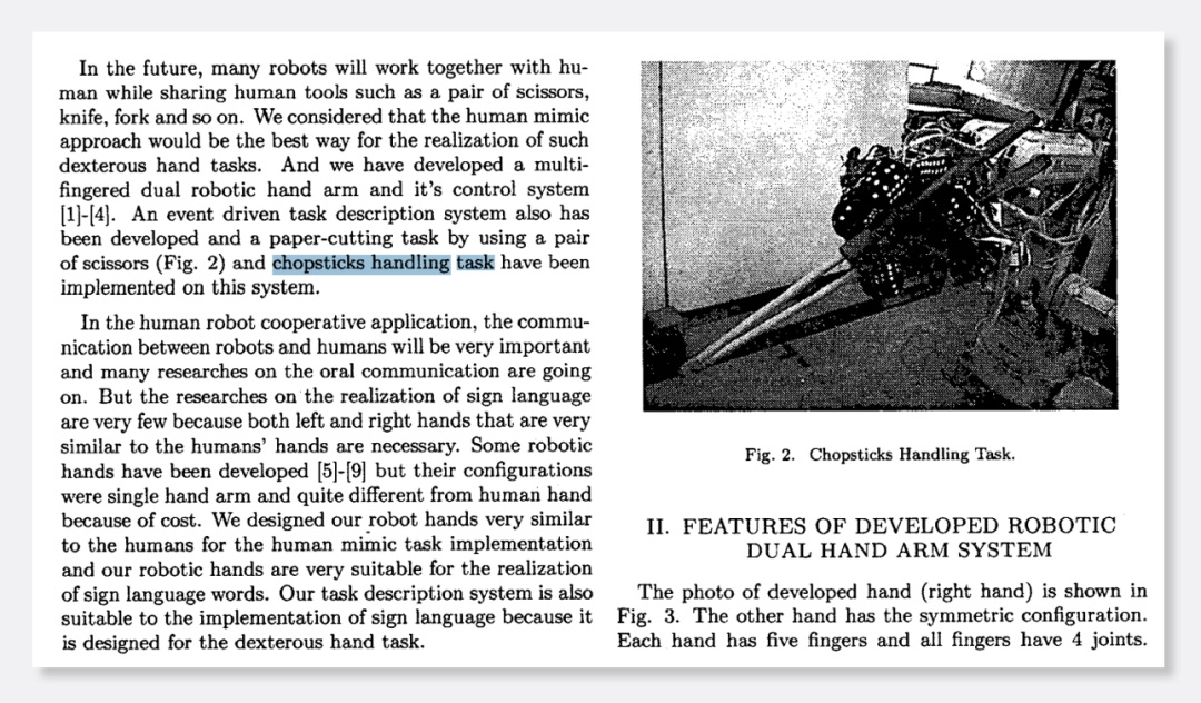 这是 2002 年发表在 IEEE 上的一篇论文,为了让机器人更好地帮助人类完成一些简单工作,研究人员发明了一双可以剪纸、使用筷子的机器手。