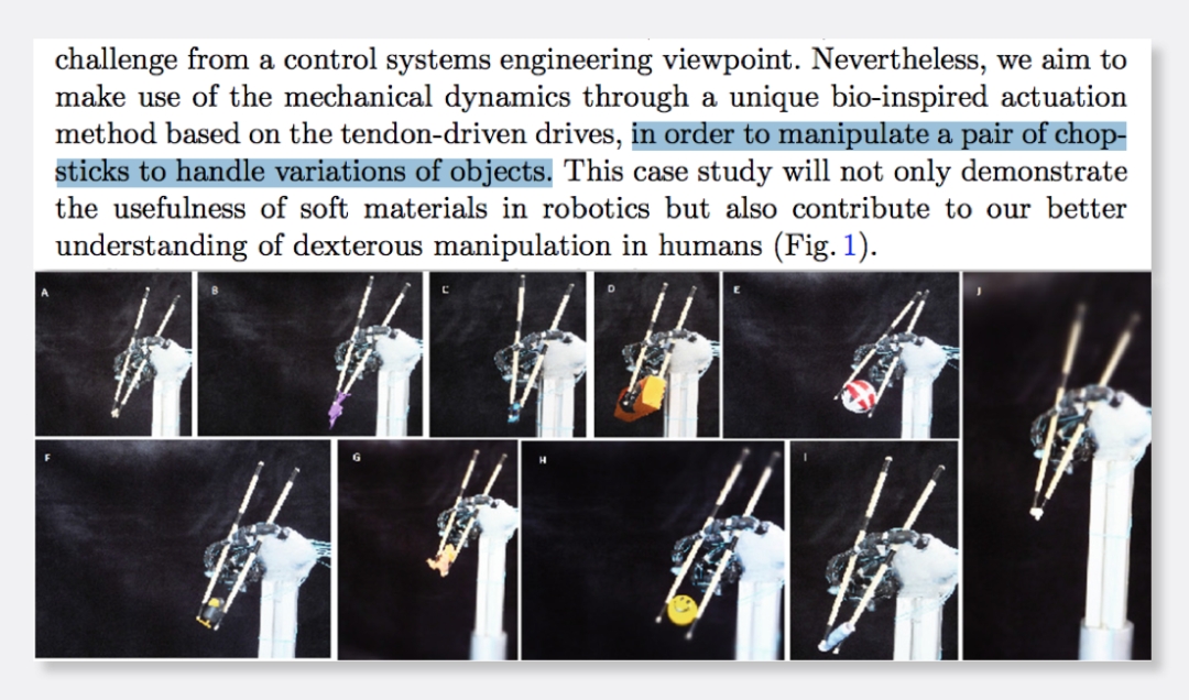 但使用筷子是一项精密运动,所以在很多机械手的相关研究中,人们将「学会使用筷子」作为证明其达到某种灵活程度的一项指标。