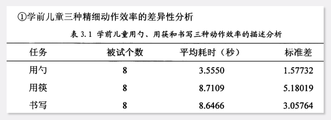 在儿童发展领域,早有研究者发现,幼儿到 3 周岁时就能非常熟练地用勺子用餐,但要到 4、5 周岁时,才能稳定拿好筷子。