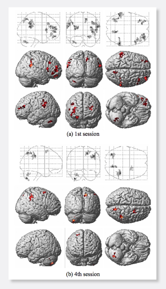 根据神经成像,学习筷子期间,脑部活动会从大脑的前部转移到后部,此外,始终可以检测到小脑活动|来源: 10.1145/642611.642684
