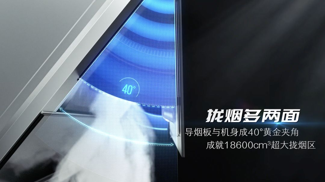 当油烟机运行时,原本收在箱体内的挡烟板会展开。正面挡烟板、两侧挡烟板与箱体呈 40° 夹角。40° 正是黄金拢烟夹角,巨大的拢烟区可以让油烟无处逃散,进一步提升油烟的吸排效率。