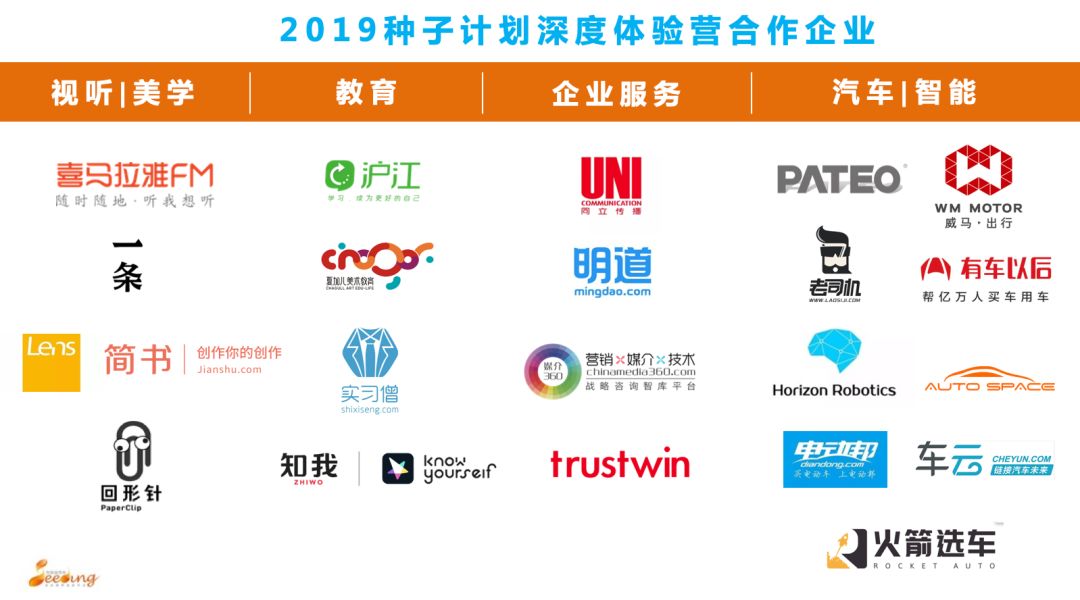 与种子计划暑期深度实习合作的企业,均为从零到一的新兴商业体,他们为学生做岗位规划、提供高管指导和实习反馈。今年的20多家公司主要来自“音视频 | 美学”、“互联网教育”、“企业服务”和“智能 | 出行”等领域。