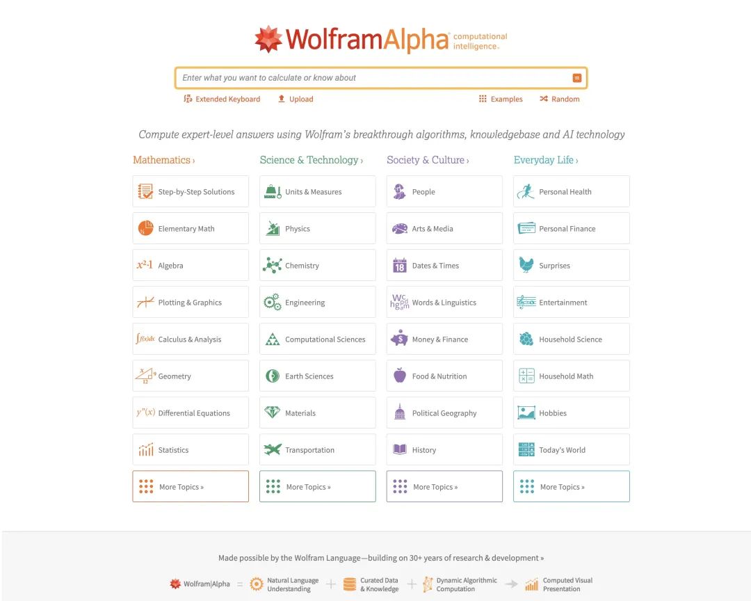 Wolfram Alpha 不是像百度或者谷歌那样的搜索引擎,而是一个能读懂自然语言的知识引擎。目前它能回答超过 30 个领域的问题,上知天文,下知地理,中晓人和。