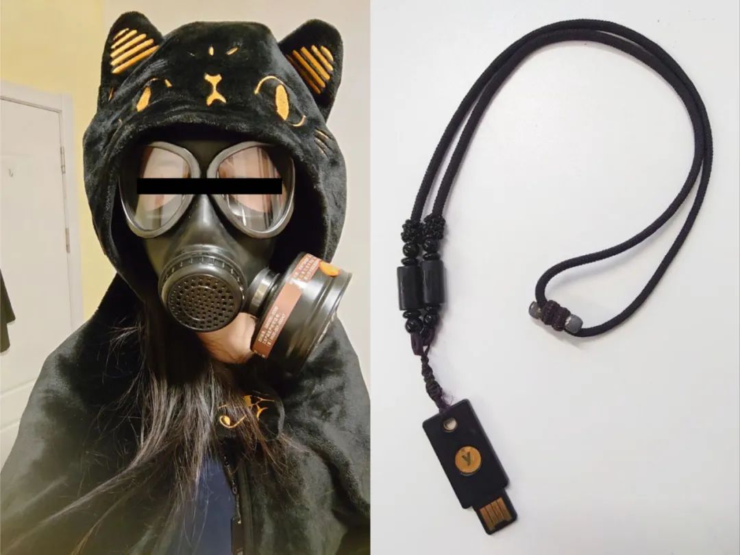 朋友圣诞节送我的埃及猫猫披肩、前一阵子瞎买的防毒面具和脖子上那个锈迹斑斑的 YubiKey,抱着试一试的心态组合在一起发现效果意外的不错,如果仔细看那个 YubiKey 的话,还会发现上面的绳子有一种神秘东方宗教的感觉。