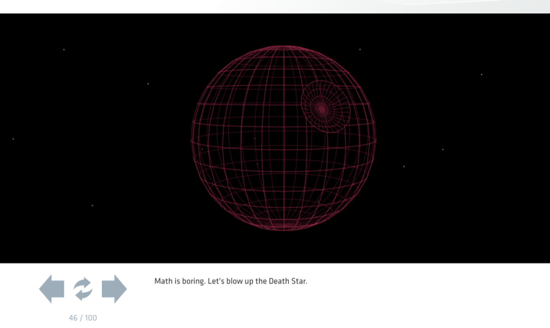 关键是还有交互。比如在讲解物体的旋转动画时,作者还做了一个 100 步的交互,甚至还插入了一个星球大战的角色扮演小游戏。