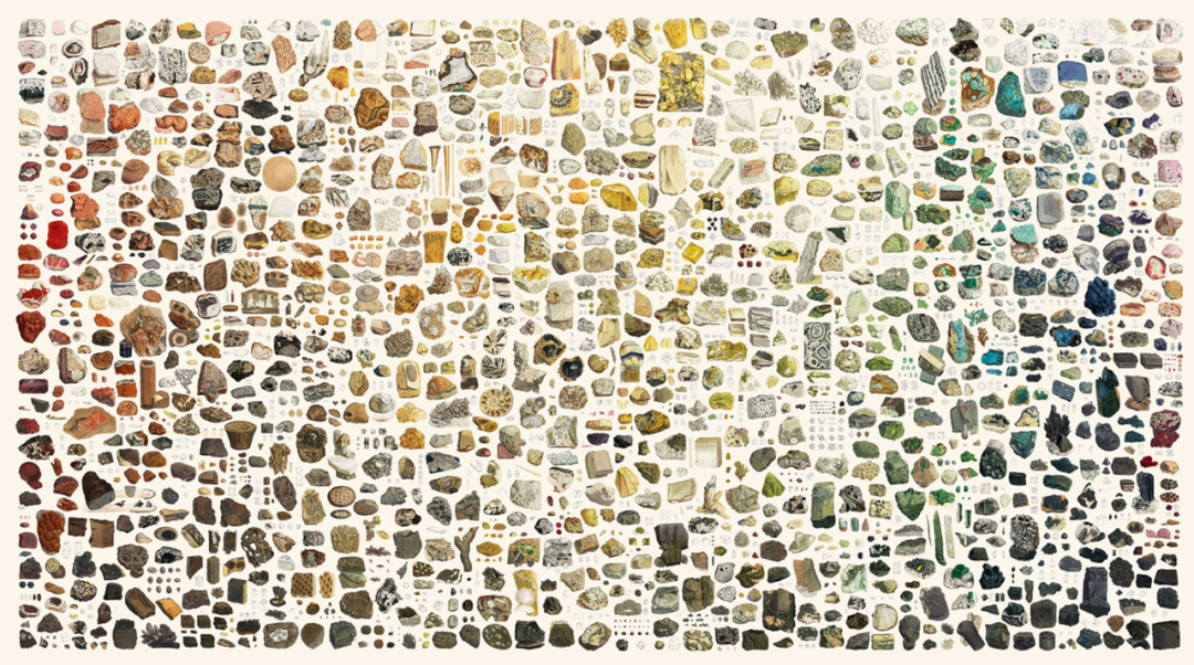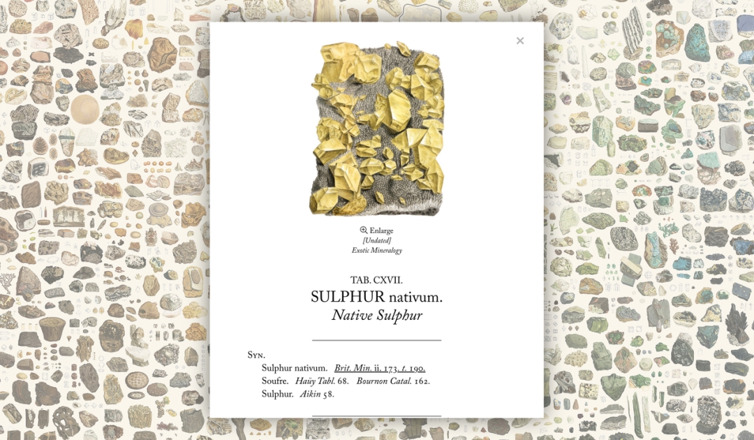 设计师 Nicholas Rougeux 根据插画的色调和亮度,对其中的 718 种矿物,共 2242 幅插画重新做了排版。进入这个网站:https://c82.net/mineralogy/# ,你可以点击感兴趣的矿物,查阅它背后的故事。