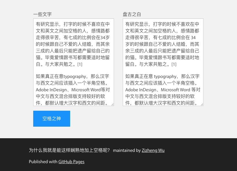 快来登入这个神奇的网页:https://zizhengwu.github.io/daft-auto-spacing/ ,将你那中西文紧密混合的文档复制粘贴进左边的「一些文字」框中,一键召唤空格之神,了解一下为什么 I 就是能这样娴熟地加上 space ,让我的中 English 混合双写看起来如此清爽的原因吧~