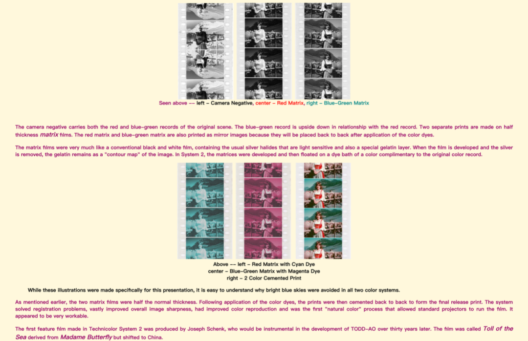 比如「Development of Color Cinematography」栏目中,你可以找到电影史上几乎所有胶片上色技术,甚至还有原理解析,比我写的视频稿简洁明了多了。「鲜为人知的色彩处理」一部分,还记录了 20 种应用在早期电影中应用过,却未被推广的技术手段。